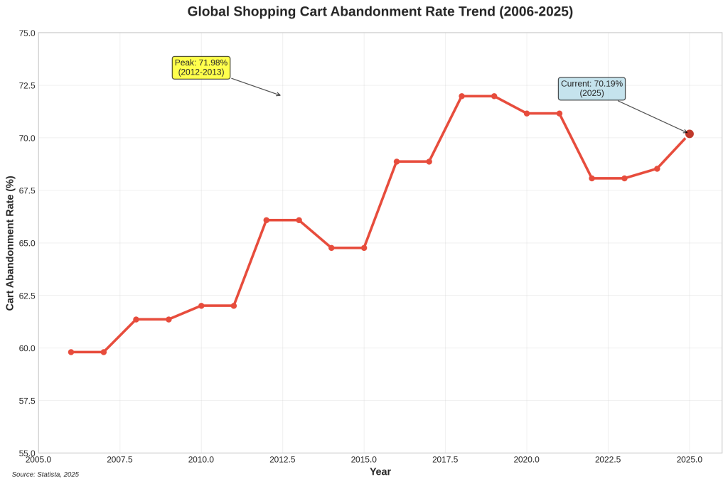 - Cart Abandonment Crisis:Â Global cart abandonment rates have reached 70.19% in 2025, representing billions in lost revenue annually [3]