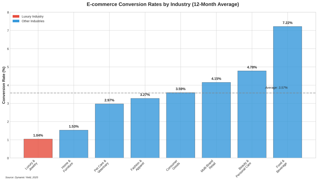 The challenge facing luxury ecommerce becomes apparent when examining conversion rate benchmarks across industries. According to Dynamic Yield’s comprehensive industry analysis, luxury and jewelry retailers consistently demonstrate the lowest conversion rates at 1.04%, significantly below the global ecommerce average of 3.21% [1]. This performance gap reflects the inherent complexity of luxury purchasing decisions, where consumers require additional assurance, detailed product information, and seamless experiences that mirror the white-glove service traditionally associated with luxury boutiques.