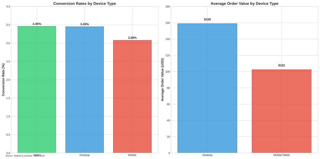 Device-specific conversion rate analysis provides additional context for mobile optimization priorities. According to Dynamic Yield’s industry benchmarks, tablet devices achieve the highest conversion rates at 3.46%, followed closely by desktop at 3.45%, with mobile devices achieving 3.08% [1]. These performance differences reflect the varying capabilities and user experience constraints of different device types, with tablets offering an optimal balance between portability and screen real estate that supports detailed product evaluation and streamlined checkout processes.