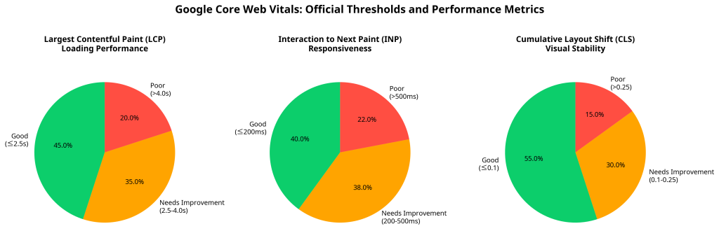 Google’s official Core Web Vitals thresholds are: Largest Contentful Paint (LCP) should occur within 2.5 seconds, Interaction to Next Paint (INP) should be less than 200 milliseconds, and Cumulative Layout Shift (CLS) should maintain a score below 0.1. These thresholds represent “good” performance levels that support both user experience and search ranking optimization.