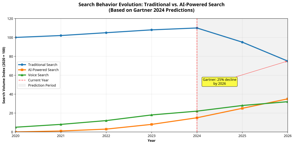 The search landscape is experiencing fundamental transformation as artificial intelligence reshapes how users discover information and how search engines deliver results. Gartner’s prediction of a 25% decline in traditional search engine volume by 2026 represents more than a statistical projection; it signals the emergence of new information discovery paradigms that require strategic adaptation from organizations dependent on organic search visibility [1]. Understanding and preparing for these changes has become essential for maintaining competitive positioning in an evolving digital ecosystem.
