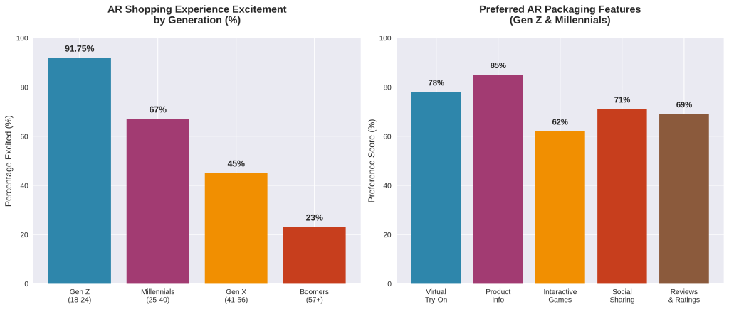 Consumer behavior analysis reveals distinct engagement patterns between generational cohorts, with millennials and Generation Z demonstrating markedly different preferences and expectations for AR packaging experiences. Generation Z, comprising individuals born between 1997 and 2012, shows the highest enthusiasm for AR technology, with 91.75% actively seeking AR-enabled shopping experiences [2]. This cohort’s digital nativity translates into intuitive adoption of AR interfaces and higher tolerance for experimental brand interactions. Millennials, while slightly less enthusiastic at 67% excitement rates for AR shopping experiences, demonstrate greater purchasing power and brand loyalty when positive AR experiences occur.
