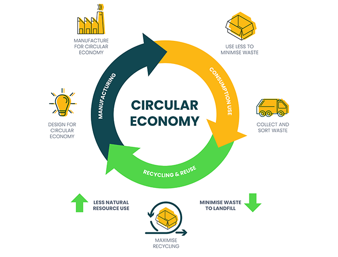 A circular economy is an economic model focused on sustainability. It aims to minimize waste and make the most of resources by reusing, recycling, and regenerating materials throughout their lifecycle.