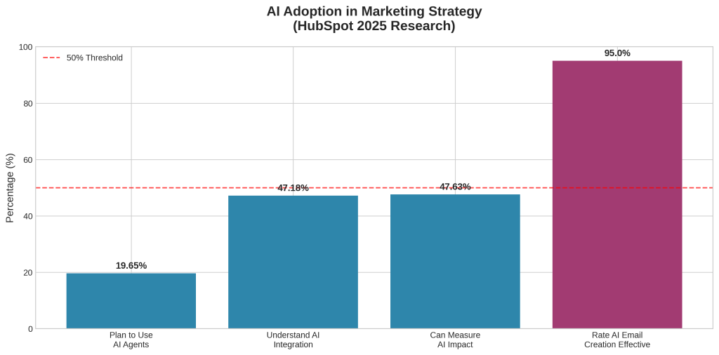 HubSpot’s research indicates that 47.18% of marketers say they understand how to incorporate AI into their marketing strategy, while 47.63% say they know how to measure AI’s impact [3]. These relatively low percentages suggest that even as organizations invest in advanced technologies, many lack the strategic framework necessary to leverage these tools effectively within a holistic marketing approach.