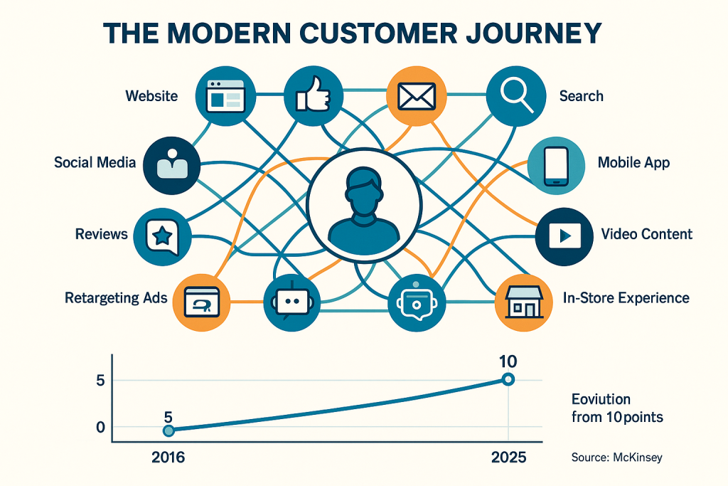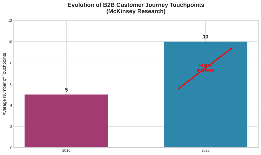 The modern customer journey has evolved into a complex, multi-touchpoint experience that challenges traditional linear marketing models. McKinsey’s research documents a fundamental shift in B2B buyer behavior: customers now use an average of 10 points of interaction during a typical sales journey, compared to only 5 in 2016 [2]. This 100% increase in touchpoint complexity represents more than a quantitative change—it reflects a qualitative transformation in how customers research, evaluate, and purchase products and services.