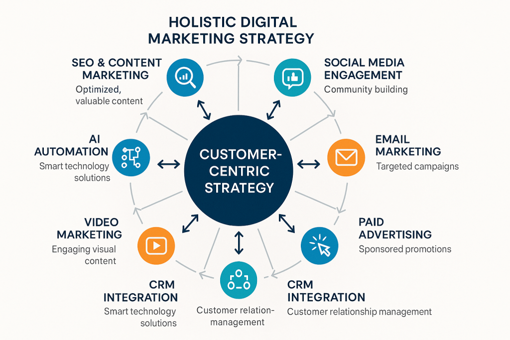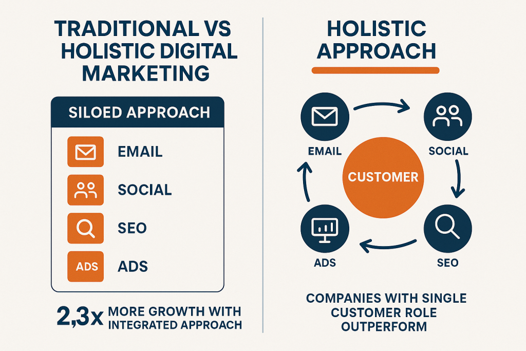 Traditional marketing typically operates in silos, with different channels and campaigns managed independently. Holistic digital marketing integrates all marketing channels and touchpoints around a customer-centric strategy, creating coordinated experiences across the entire customer journey. McKinsey research shows that companies with integrated approaches achieve 2.3 times more growth than those with fragmented marketing responsibilities [2].