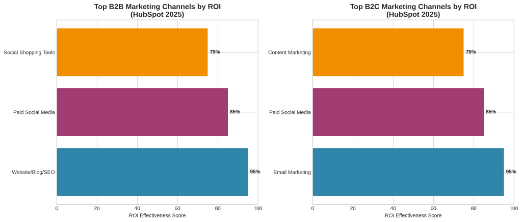 Channel effectiveness varies by business type. For B2B organizations, the top ROI channels are website/blog/SEO efforts, paid social media, and social shopping tools. For B2C brands, email marketing leads with 2.8% conversion rates, followed by paid social media and content marketing [3]. However, the synergistic effects of integration often exceed individual channel performance.