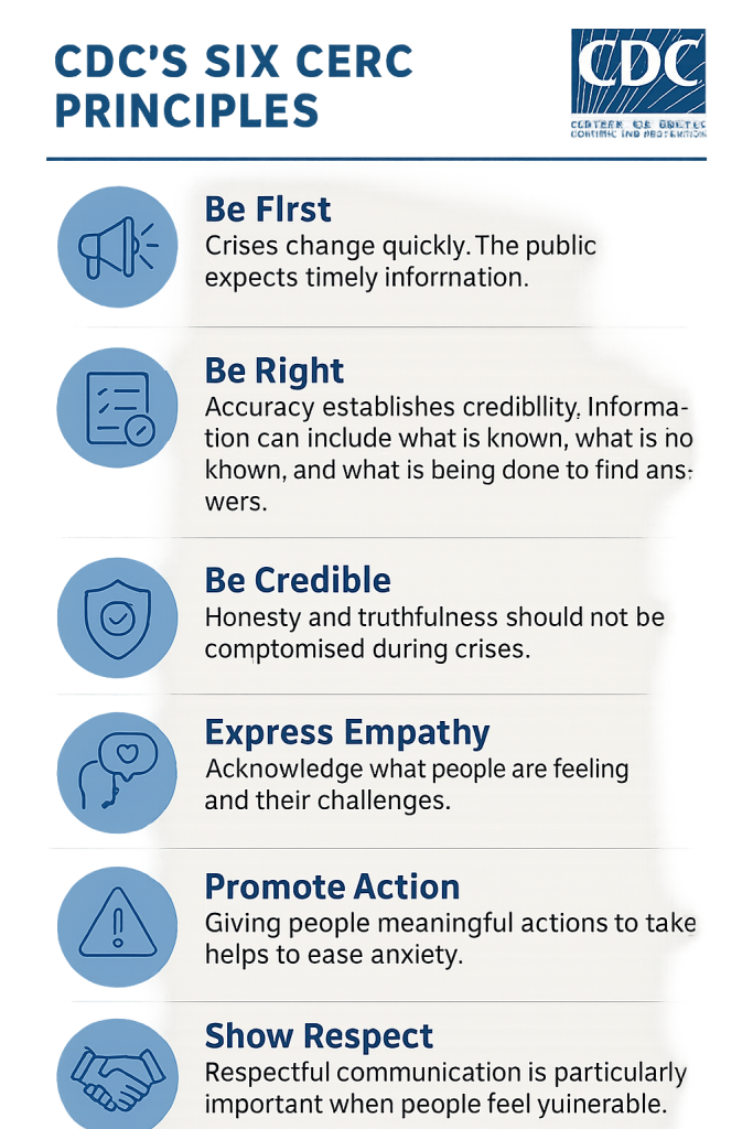 - Centers for Disease Control and Prevention. (2018). Crisis and Emergency Risk Communication (CERC): Introduction. Retrieved from https://www.cdc.gov/cerc/php/cerc-manual/index.html