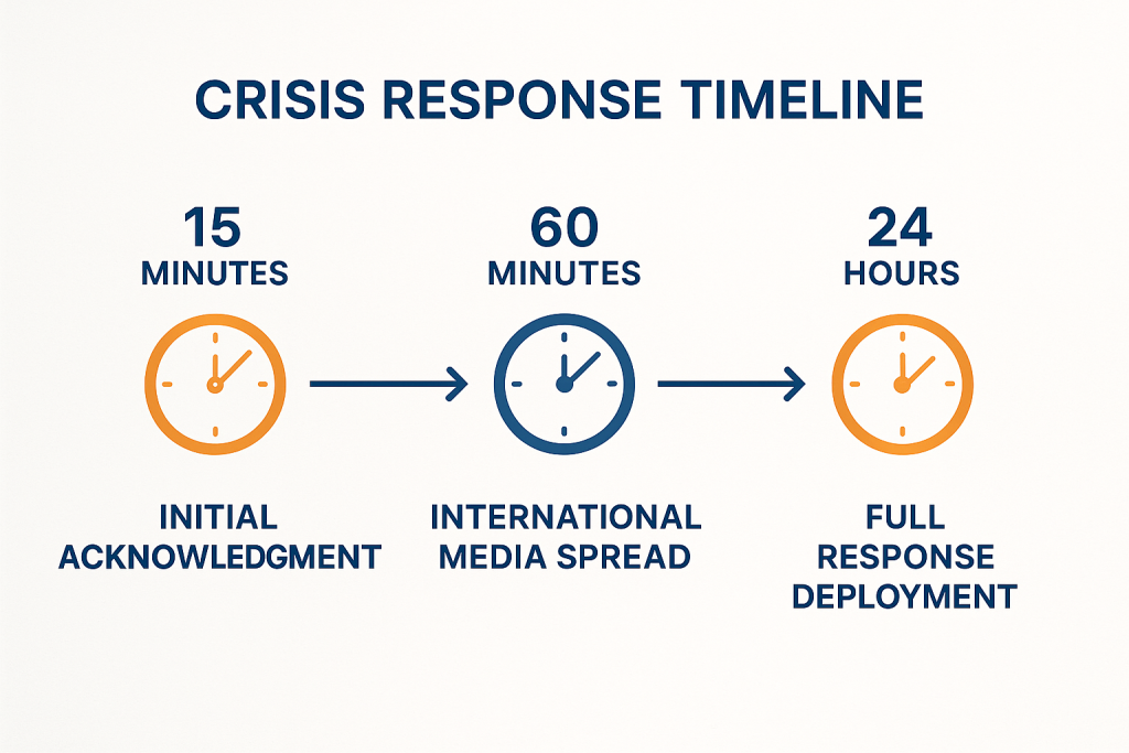When crisis situations emerge, organizations must execute rapid response protocols that balance speed with accuracy, transparency with strategic messaging, and global reach with local sensitivity. Industry research establishes clear benchmarks for crisis response timing, with the widely accepted “15-20-60-90” timeline serving as the foundation for real-time crisis management [30].