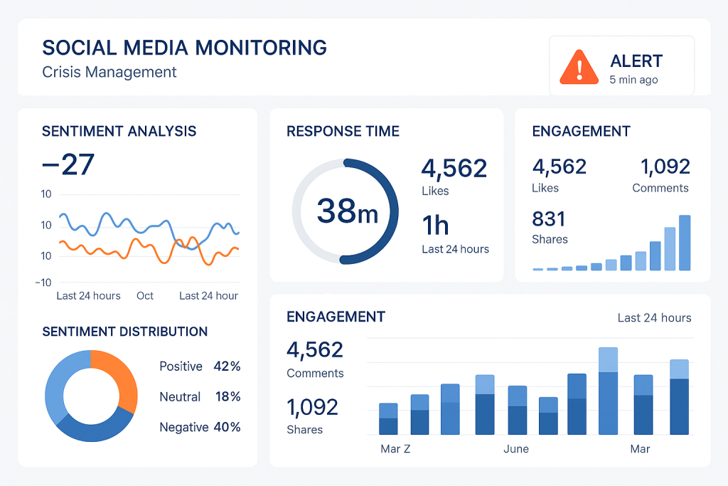 Social media crisis management increasingly relies on real-time data visualization to track crisis development, monitor stakeholder responses, and guide tactical decision-making. Dashboard interfaces that display sentiment trends, engagement metrics, and response times enable crisis teams to make data-driven decisions under time pressure [48].