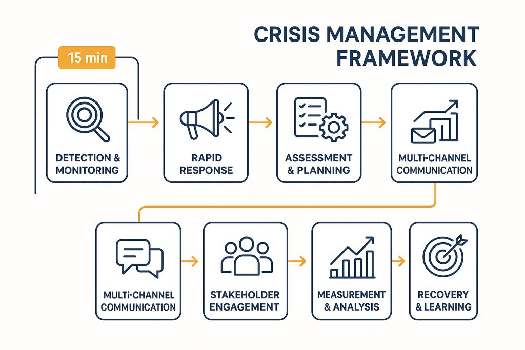 | Pre-Crisis Preparation | Monitoring systems, protocol development, relationship building | Detection speed, response readiness, stakeholder trust |