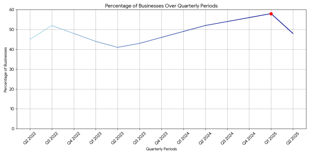 - Inflation concerns have moderated but remain significant: 48% of small businesses cite inflation as their top concern in Q2 2025, down from 58% in Q1 2025, but still representing the primary business challenge across all sectors.