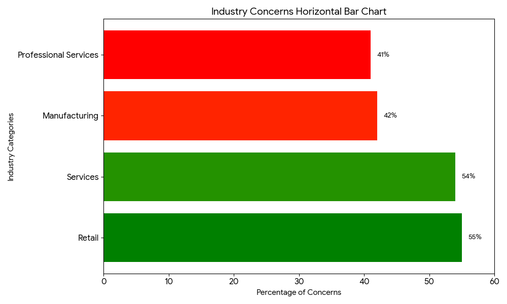 A horizontal bar chart comparing inflation concern levels across different business sectors, illustrating the varying impact of inflation on retail (55%), services (54%), manufacturing (42%), and professional services (41%).