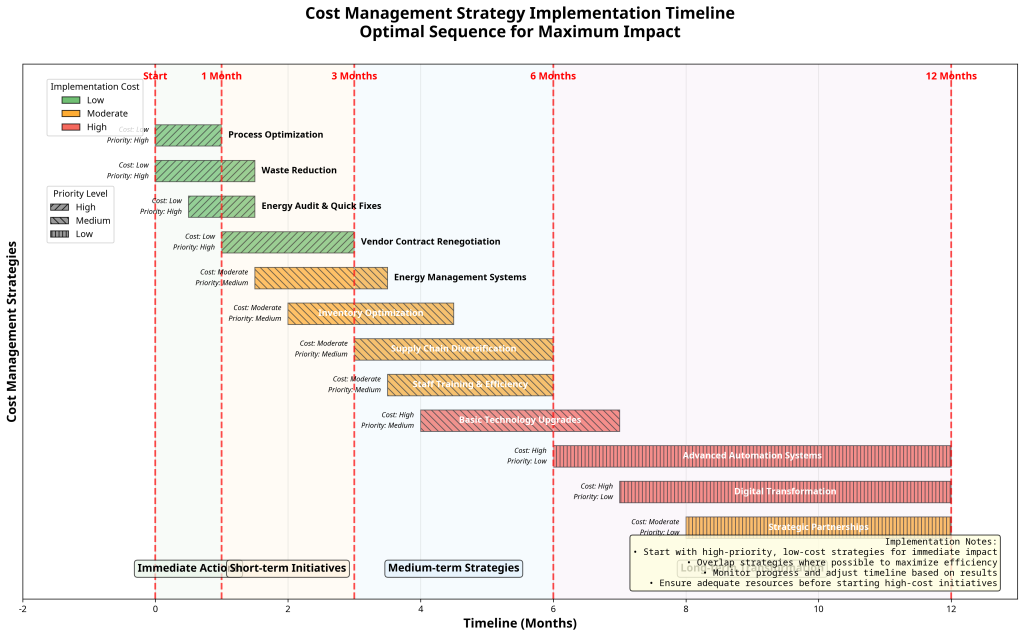 Process optimization, waste reduction, energy management, and technology automation provide cost savings without quality compromise. Focus on eliminating inefficiencies rather than reducing service levels. Supplier relationship improvements and inventory optimization also offer significant savings opportunities.