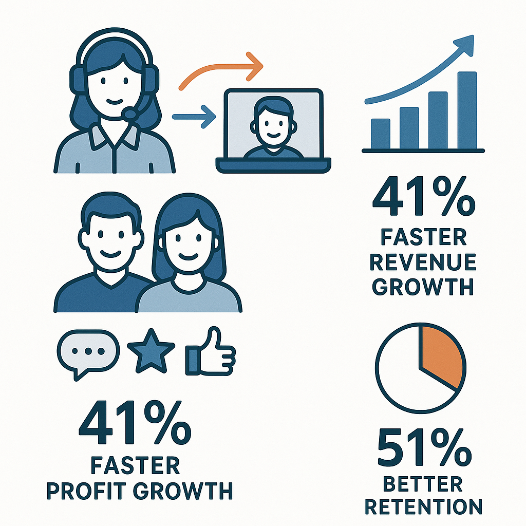 - Customer obsession delivers measurable results:Â Organizations achieving customer-obsessed status report 41% faster revenue growth and 49% faster profit growth, demonstrating that customer experience investments generate substantial returns when implemented systematically.