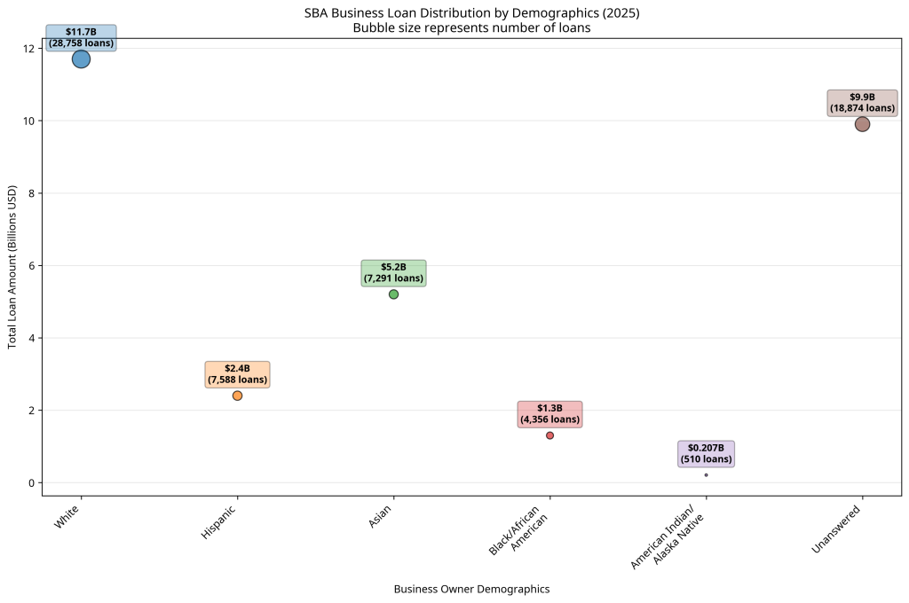 The SBA data reveals important patterns in how businesses utilize growth capital. Hispanic-owned businesses received 11.3% of approved loans totaling $2.4 billion, while Asian-owned businesses captured 10.8% of approvals worth $5.2 billion. This diversity in loan recipients indicates that strategic financing opportunities exist across demographic segments, though access patterns vary significantly.