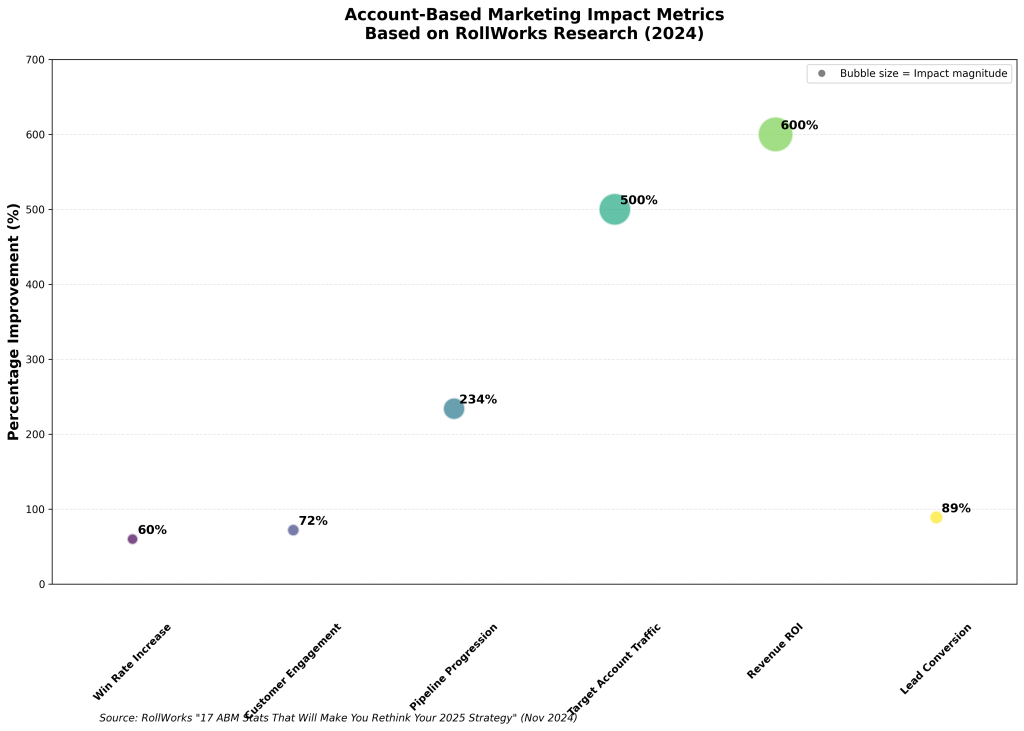 The strategic importance of ABM extends beyond immediate ROI improvements. Research indicates that organizations implementing ABM strategies experience fundamental improvements in their go-to-market effectiveness. RollWorks’ comprehensive analysis of ABM statistics reveals that companies aligning ABM with Account-Based Advertising see 60% higher win rates, while ABA campaigns increase customer engagement by 72% [4]. These metrics underscore ABM’s role in creating more meaningful, productive interactions with target accounts.