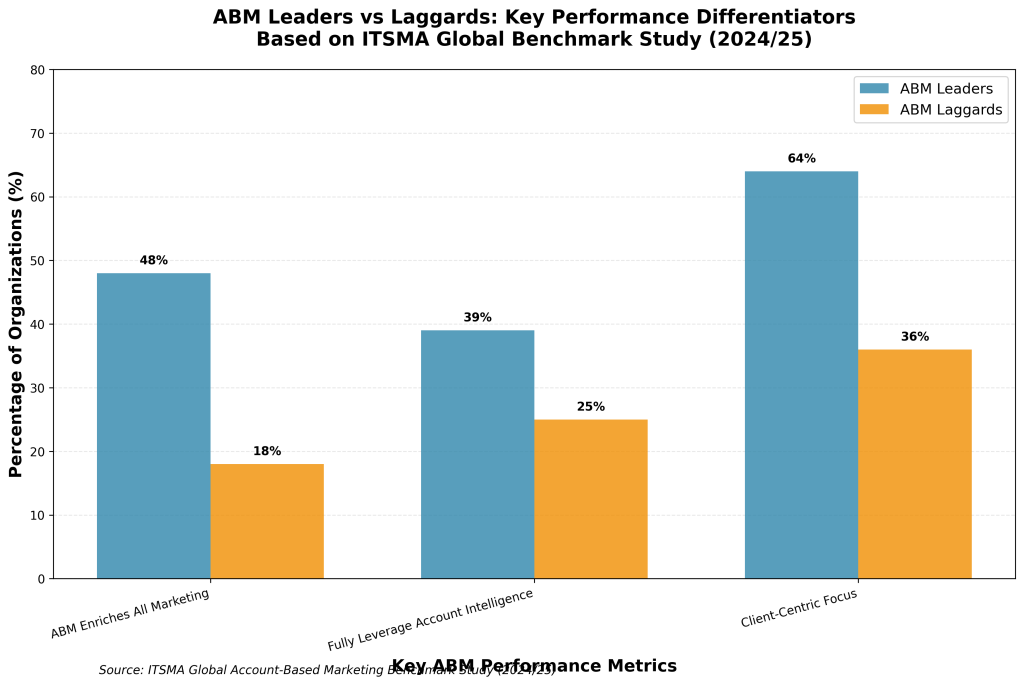 The complexity of integrated execution explains why ITSMA research shows that 48% of ABM leaders say ABM enriches all their marketing activity, compared to only 18% of laggards [1]. Leaders understand that ABM is not a separate marketing channel but an integrated approach that transforms how all marketing activities support account development.