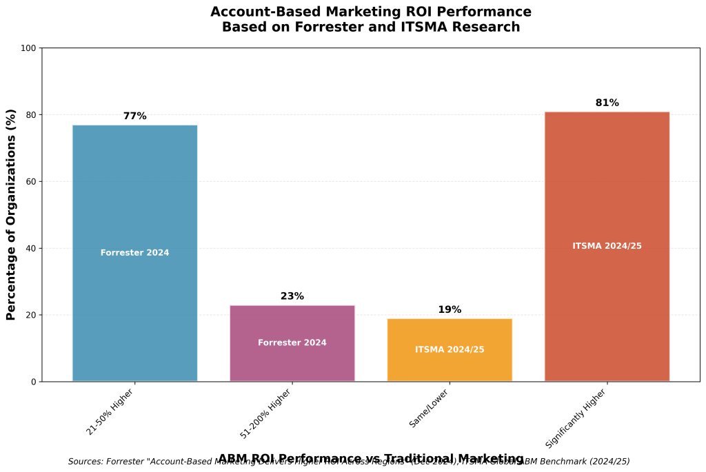 Account-based marketing (ABM) has emerged as the most effective B2B marketing strategy, with 81% of organizations reporting higher ROI compared to traditional marketing approaches. Recent research from Forrester reveals that companies implementing ABM strategies see 21-50% higher returns, while 23% achieve even more dramatic improvements of 51-200% higher ROI. This comprehensive guide examines the evidence-based best practices that separate successful ABM programs from underperforming initiatives, drawing on authoritative research from leading institutions including Forrester, ITSMA, and HubSpot.