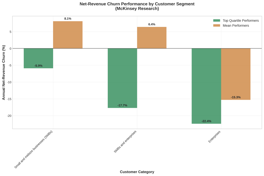 - Top-quartile performers achieve 14-23 percentage points lower net-revenue churn than mean performers across all customer segments, with the largest gaps in mixed SMB and enterprise categories (McKinsey research).