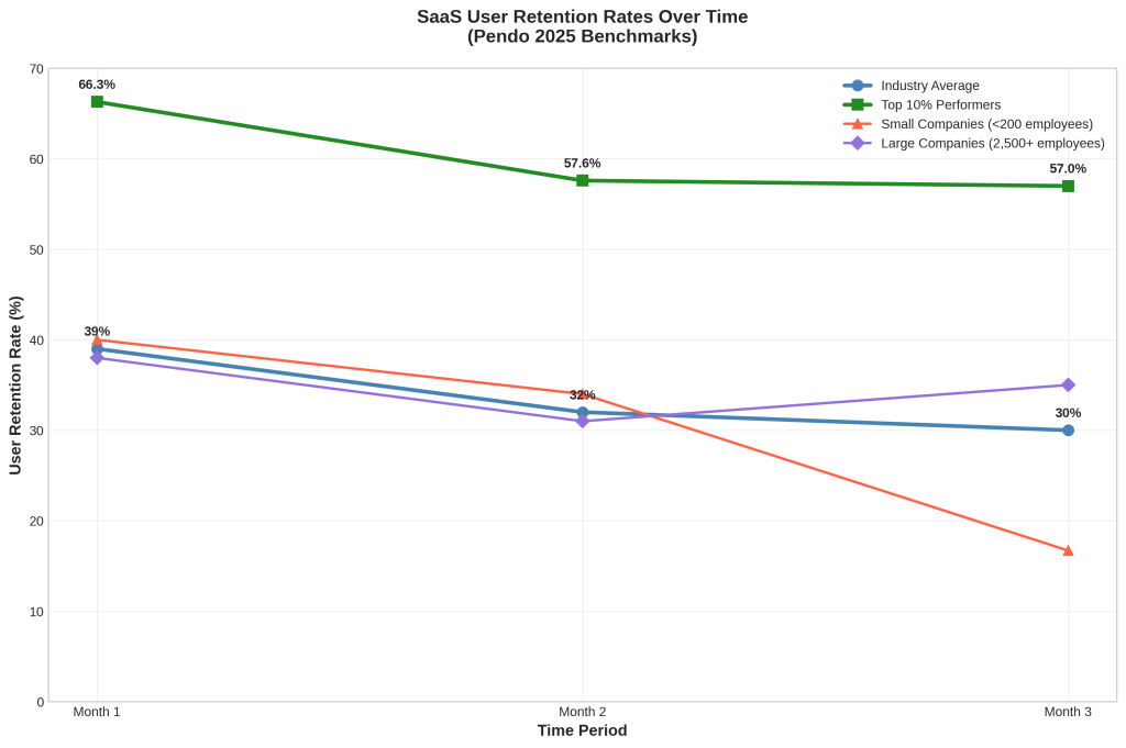Industry benchmarks for retention rates vary significantly across sectors and business models. Pendo’s 2025 research indicates that software products retain an average of 39% of users after one month, declining to approximately 30% after three months [2]. However, these user retention rates differ substantially from customer retention rates, particularly in B2B environments where multiple users may represent a single customer account.