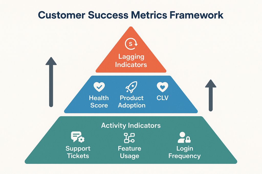 Understanding customer success requires a structured approach to measurement that distinguishes between different types of indicators. McKinsey’s research on customer success emphasizes the importance of segmenting metrics into three distinct categories: lagging indicators, activity indicators, and leading indicators [1]. This hierarchical framework provides organizations with a comprehensive view of customer health while enabling proactive intervention strategies.