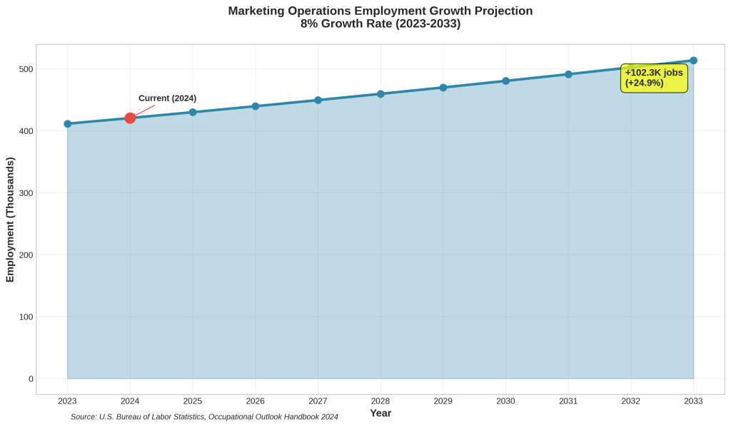 The Bureau of Labor Statistics projects 8% growth in marketing management roles from 2023 to 2033, significantly faster than the average for all occupations, with 31,100 new positions expected to emerge [2]. This growth trajectory reflects the increasing recognition that marketing operations excellence directly correlates with organizational success, as companies struggle to navigate complex customer journeys, fragmented technology ecosystems, and mounting pressure for measurable ROI.