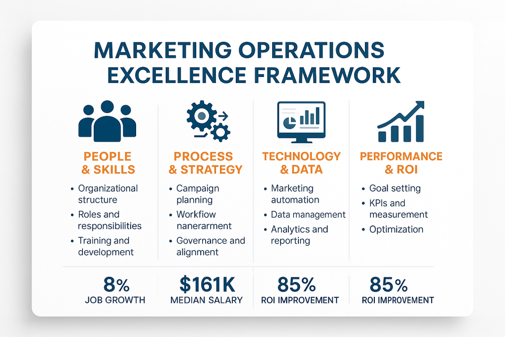 Marketing operations excellence has emerged as the cornerstone of successful B2B organizations, with companies achieving 85% ROI improvements through strategic implementation of integrated processes, technology, and data-driven decision making. As the field experiences 8% annual growth and median salaries reach $161,030, understanding the framework for operational excellence becomes critical for competitive advantage.