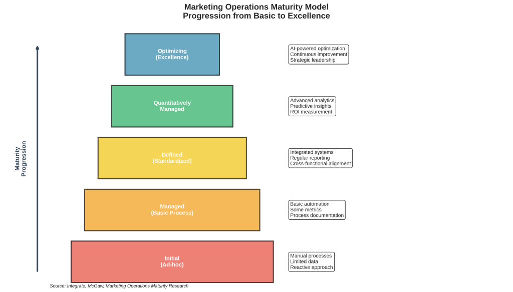 Understanding marketing operations excellence requires recognizing that organizations progress through distinct maturity stages, each characterized by specific capabilities, challenges, and opportunities. Research from Integrate and McGaw identifies five stages of marketing operations maturity: Initial, Managed, Defined, Quantitatively Managed, and Optimizing [8].