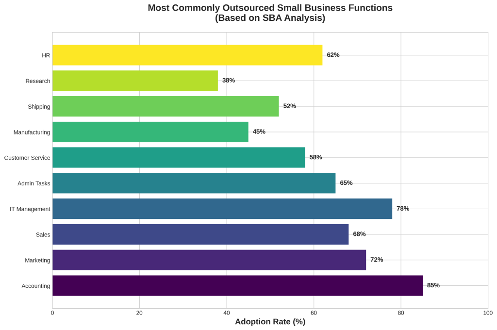 Small Business Administration research highlights the most commonly outsourced functions, providing a roadmap for organizations considering this strategic shift. Accounting leads the list as the most frequently outsourced function, followed by marketing, sales, and IT management. This prioritization reflects both the specialized expertise required and the potential for significant efficiency gains.