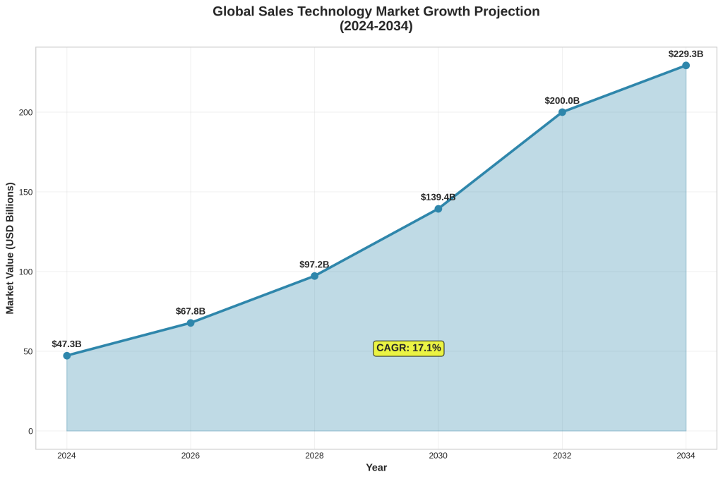 The trajectory from $47.3 billion in 2024 to a projected $229.3 billion by 2034 represents a compound annual growth rate of 17.1%, reflecting both the urgency with which organizations are investing in sales technology and the expanding scope of what constitutes essential sales infrastructure. [2] This growth significantly exceeds the broader technology sector’s projected 9.3% growth rate for 2025, indicating that sales technology has become a priority investment category for businesses across industries. [4]
