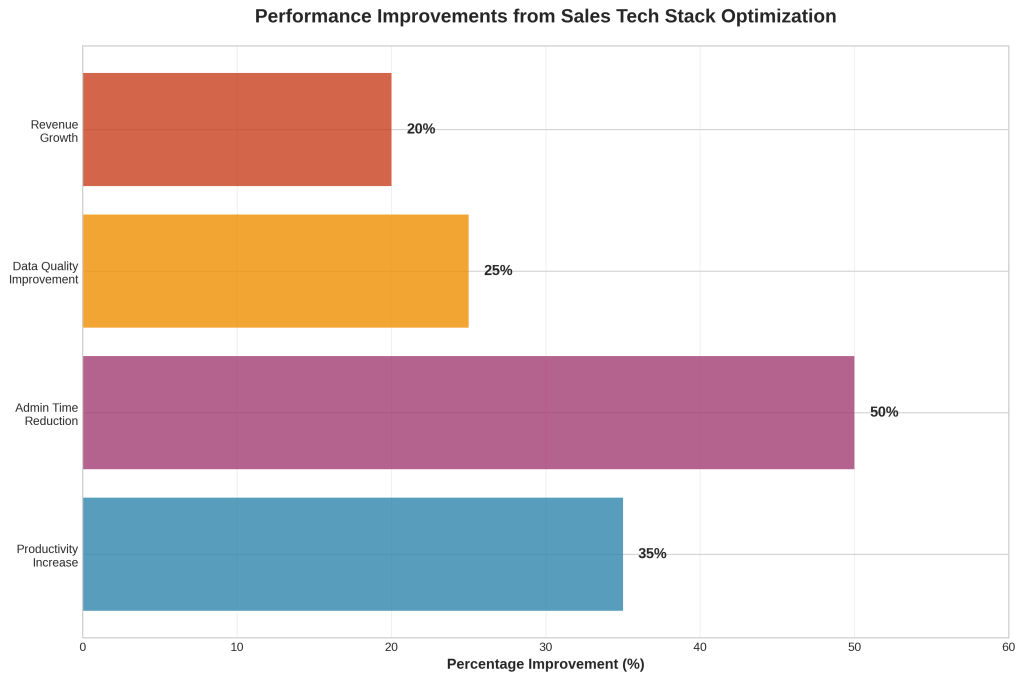Organizations that successfully optimize their sales technology stacks demonstrate measurable improvements across multiple performance dimensions. Research indicates that properly implemented sales technology can deliver a 35% increase in productivity, 50% reduction in administrative time, and 25% improvement in data quality. [3] However, achieving these outcomes requires addressing several critical implementation challenges that many organizations underestimate or ignore entirely.
