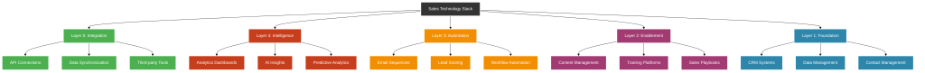 The intelligence layer represents the most rapidly evolving component of the modern sales tech stack, incorporating analytics dashboards, artificial intelligence insights, and predictive analytics capabilities. The adoption of generative AI tools in sales and marketing doubled in 2024, indicating that organizations are increasingly recognizing the potential for AI to enhance human decision-making and automate complex analytical tasks. [8] However, the implementation of AI-powered tools requires significant data quality improvements and change management initiatives to ensure that insights translate into actionable sales behaviors.