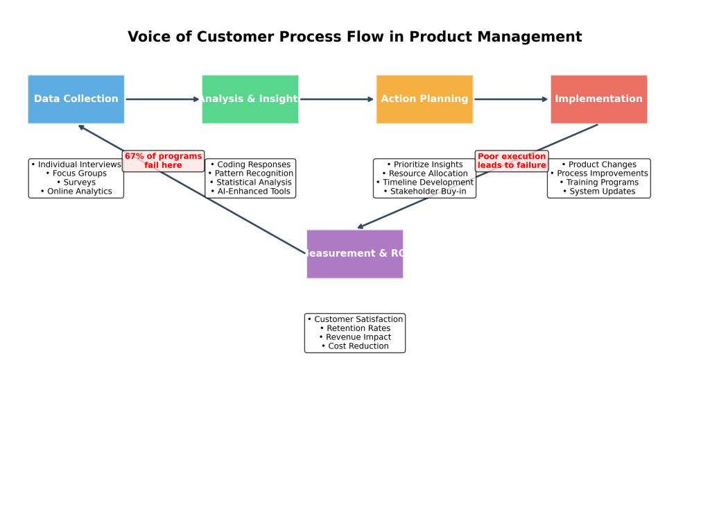 Customer experience programs, closely related to VoC initiatives, demonstrate similar challenges with failure rates exceeding 60% [4]. The primary causes of these failures include insufficient adaptation to change, lack of clear purpose, poor cross-functional collaboration, inadequate leadership support, low employee adoption rates, failure to actively listen to customers, disconnection from business value, and slow implementation timelines. These factors provide crucial insights for product managers designing VoC programs, as they highlight the organizational and operational challenges that extend beyond technical implementation.