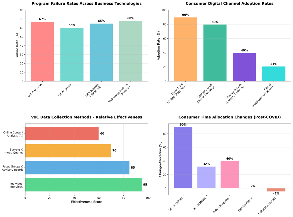 The current state of VoC implementation reveals a complex landscape of opportunities and challenges. According to comprehensive industry analysis, more than two out of three VoC programs fail to deliver actionable insights, representing a failure rate exceeding 67% [2]. This statistic aligns with historical patterns observed in related business technology implementations, where CRM projects experienced failure rates rising from 65% to over 80% in the early 2000s, and general technology projects show success probabilities of only 32% [2].